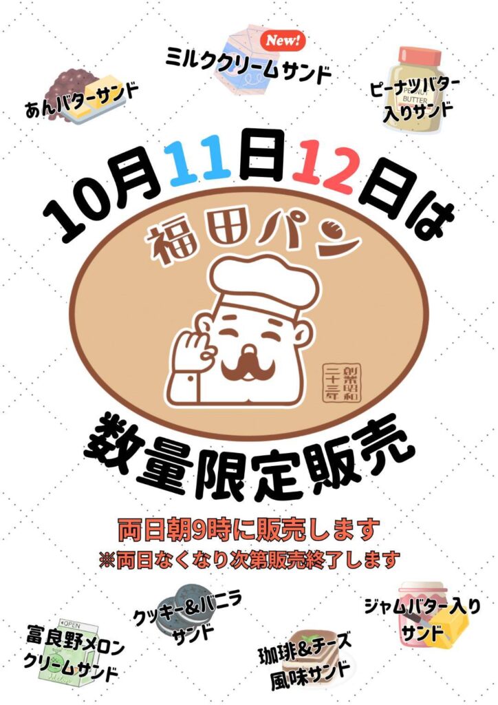 10月11日(土)、12日(日)に福田パンの販売を行います。なくなり次第終了となりますのでお気を付けください。