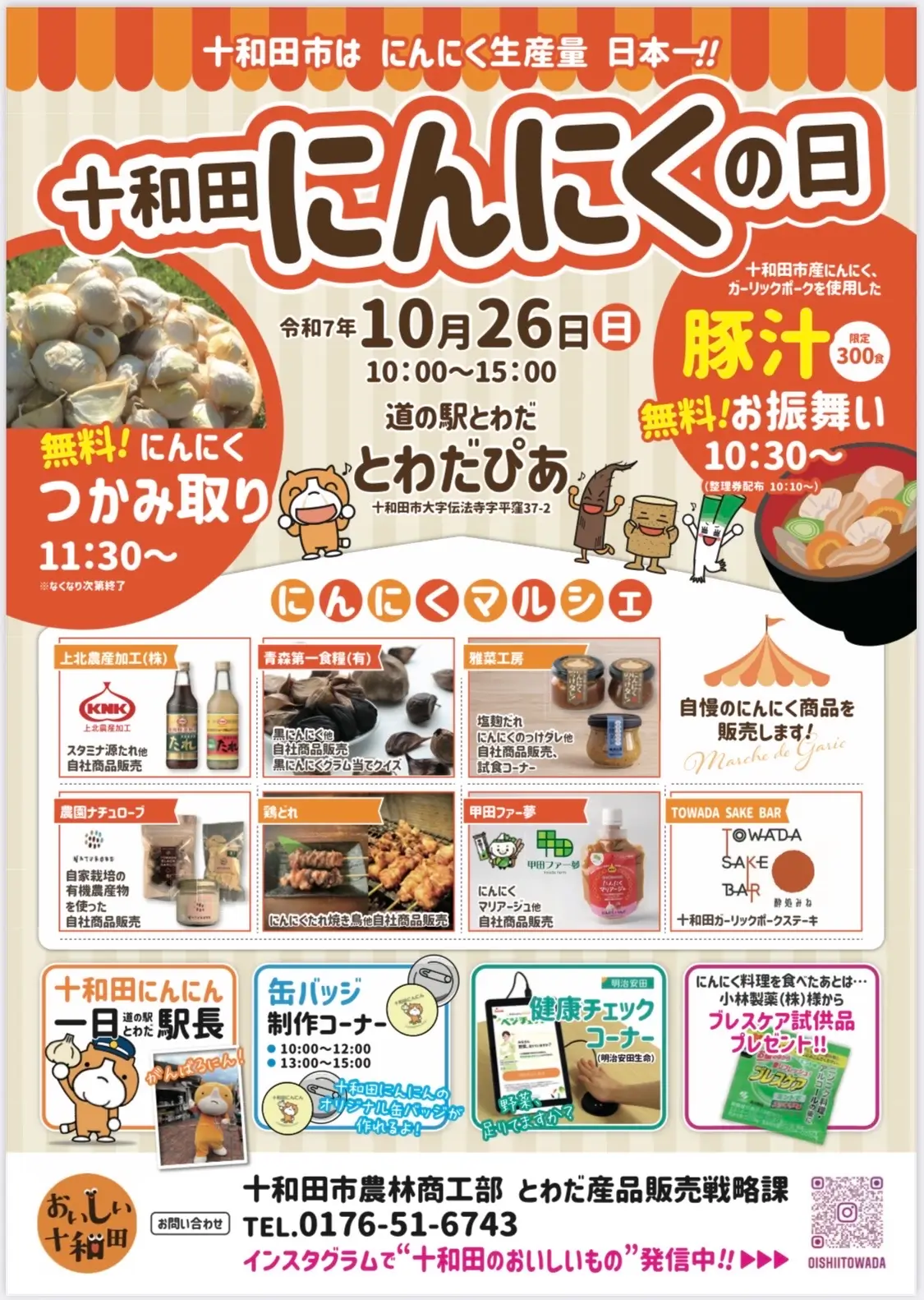 当日は、十和田市産にんにくとガーリックポークを使用した**豚汁の無料お振舞い(限定300食)や、毎年人気のにんにくつかみ取り体験(無料・11:30〜)**など、にんにくの魅力が詰まったイベントをお楽しみいただけます。