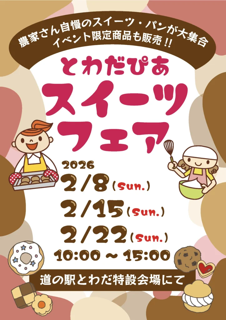 農家さん自慢のスイーツ・パンが大集合する「とわだぴあ スイーツフェア」を開催します。イベント限定商品も販売します。